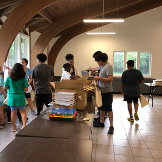 Pizza and snacks fueled the volunteers' energy for the next stage of the operation. As families arrived, they signed in, and the volunteers delivered to them the appropriate bags of pre-filled items. "We had leftover supplies from previous years," explained Sarah, "So the families were invited to pick up additional items from that table."